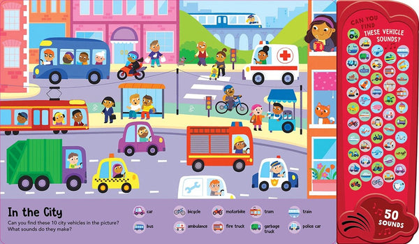 Discover the amazing sounds of different vehicles in this exciting mega sound book. Find the vehicles in each colourful scene then press the buttons to listen to the sounds.