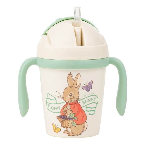 Crafted from sustainable and strong Recycled PET (rPET), this Beatrix Potter Sippy Cup has a 250ml capacity and includes a leak-proof straw and a hygienic flip top lid. With easy to Grip handles on either side, this sippy cup is perfect for use at home or for keeping hydrated on the go. The design features classic artwork of Peter Rabbit on one side and Flopsy Bunny on the other side, with accents of pale teal green on the handles and lid.