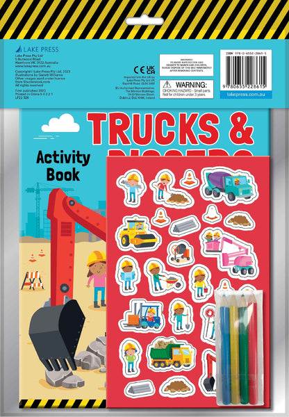 This new Trucks & Diggers Activity Fun Pack contains a colouring and activity book packed with fun trucks and construction scenes, 4 coloured pencils and a sheet of stickers, all in a resealable pouch - ideal for travel.