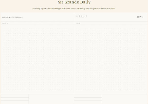 The Grande Daily Layout is exactly the same as our Signature Daily planner — but made bigger, with even more space for your daily plans, and ideas to unfold.
